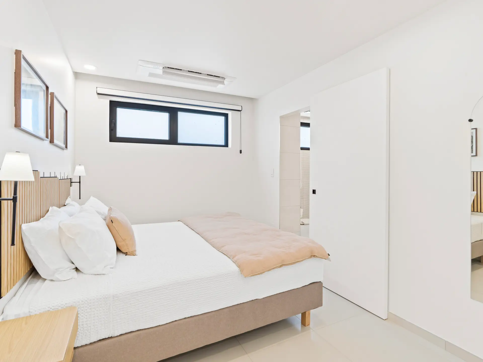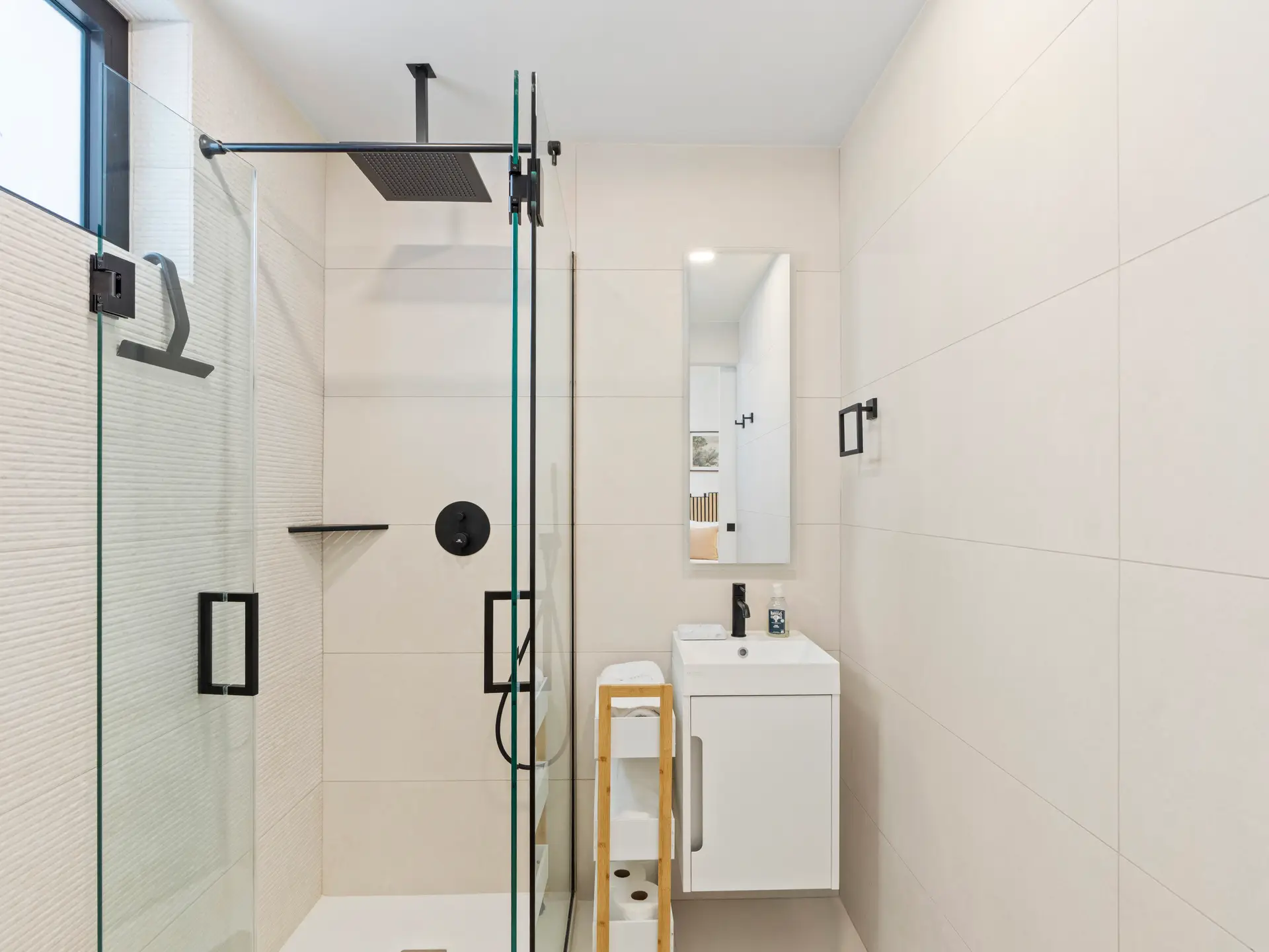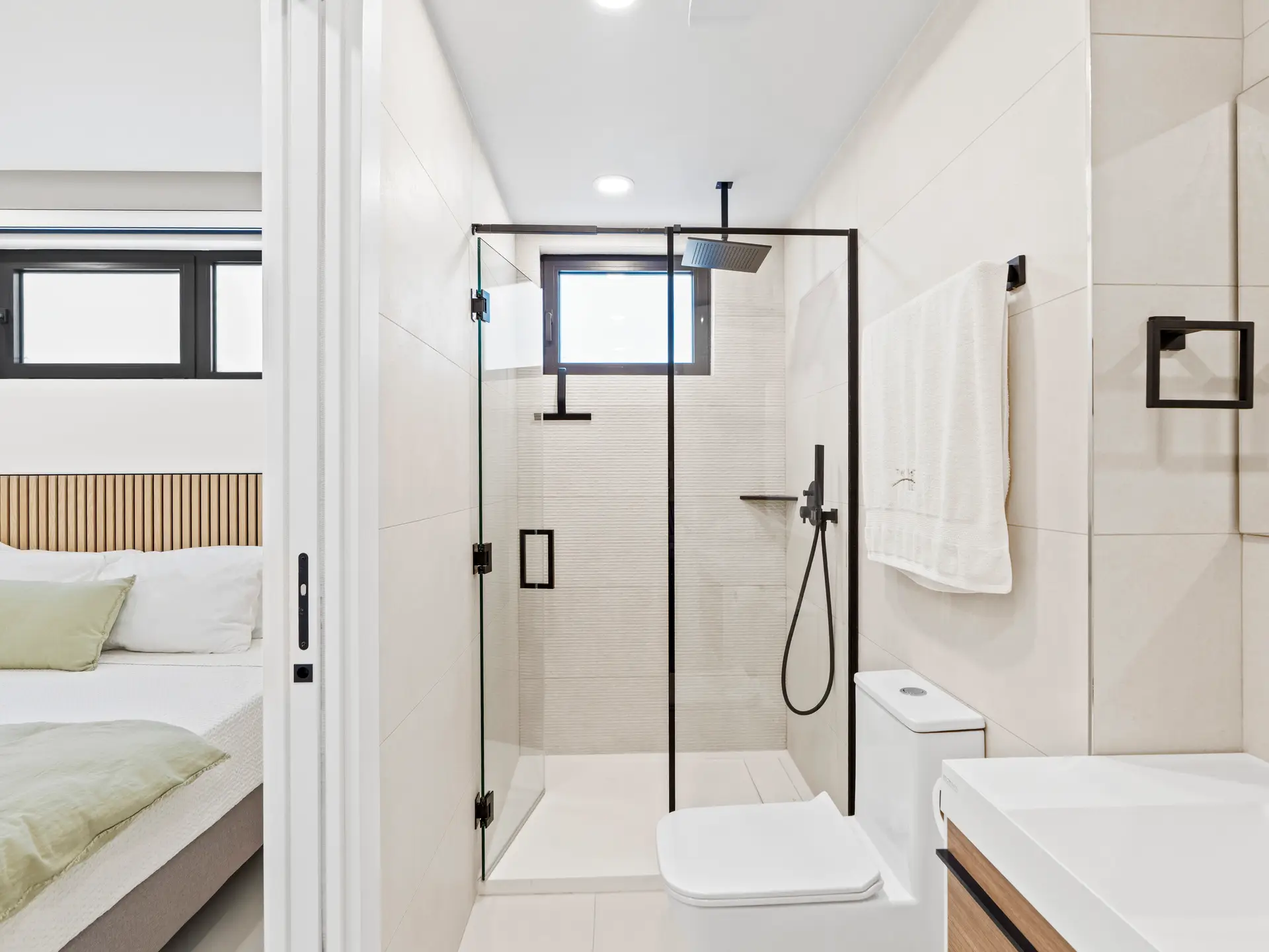 Les deux chambres sont soigneusement conçues pour offrir un maximum de confort et d’intimité. La chambre principale dispose de grandes fenêtres baignant l’espace de lumière naturelle et d’une salle de bain attenante avec une simple vasque et une luxueuse douche à effet pluie , créant ainsi un véritable havre de paix. La deuxième chambre, tout aussi chaleureuse, est idéale pour accueillir famille, amis ou invités. Elle est idéalement située à proximité de la deuxième salle de bain complète, élégamment aménagée et dotée d’équipements modernes.