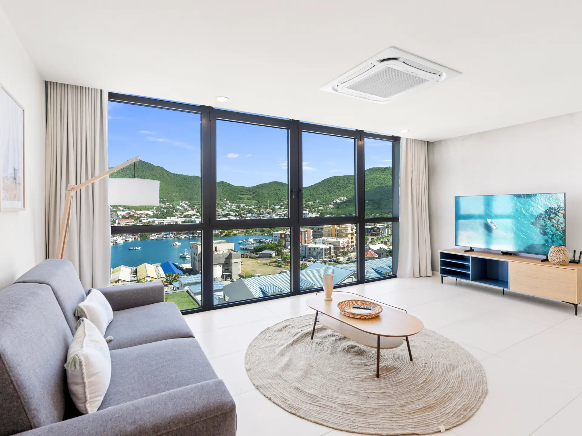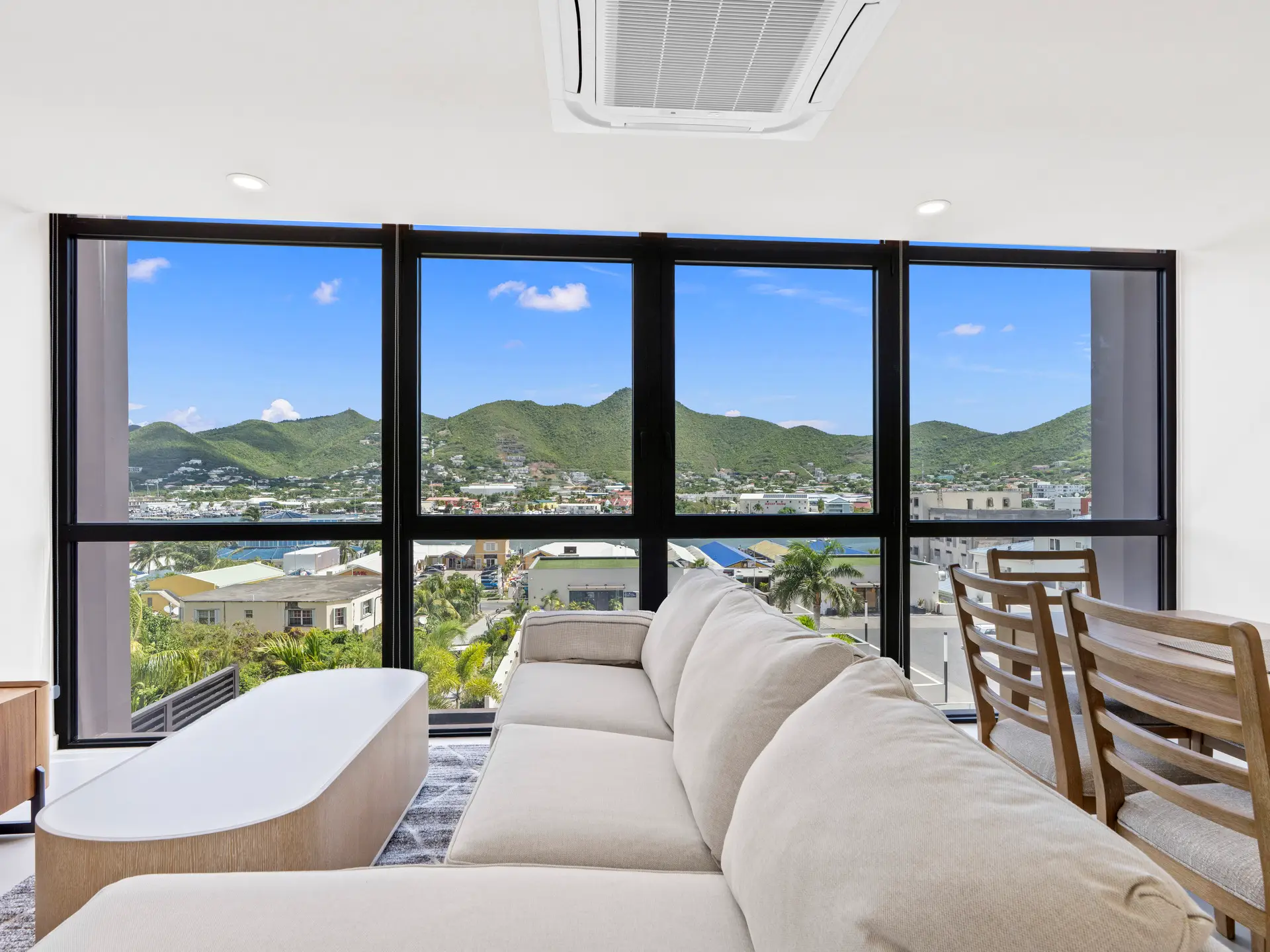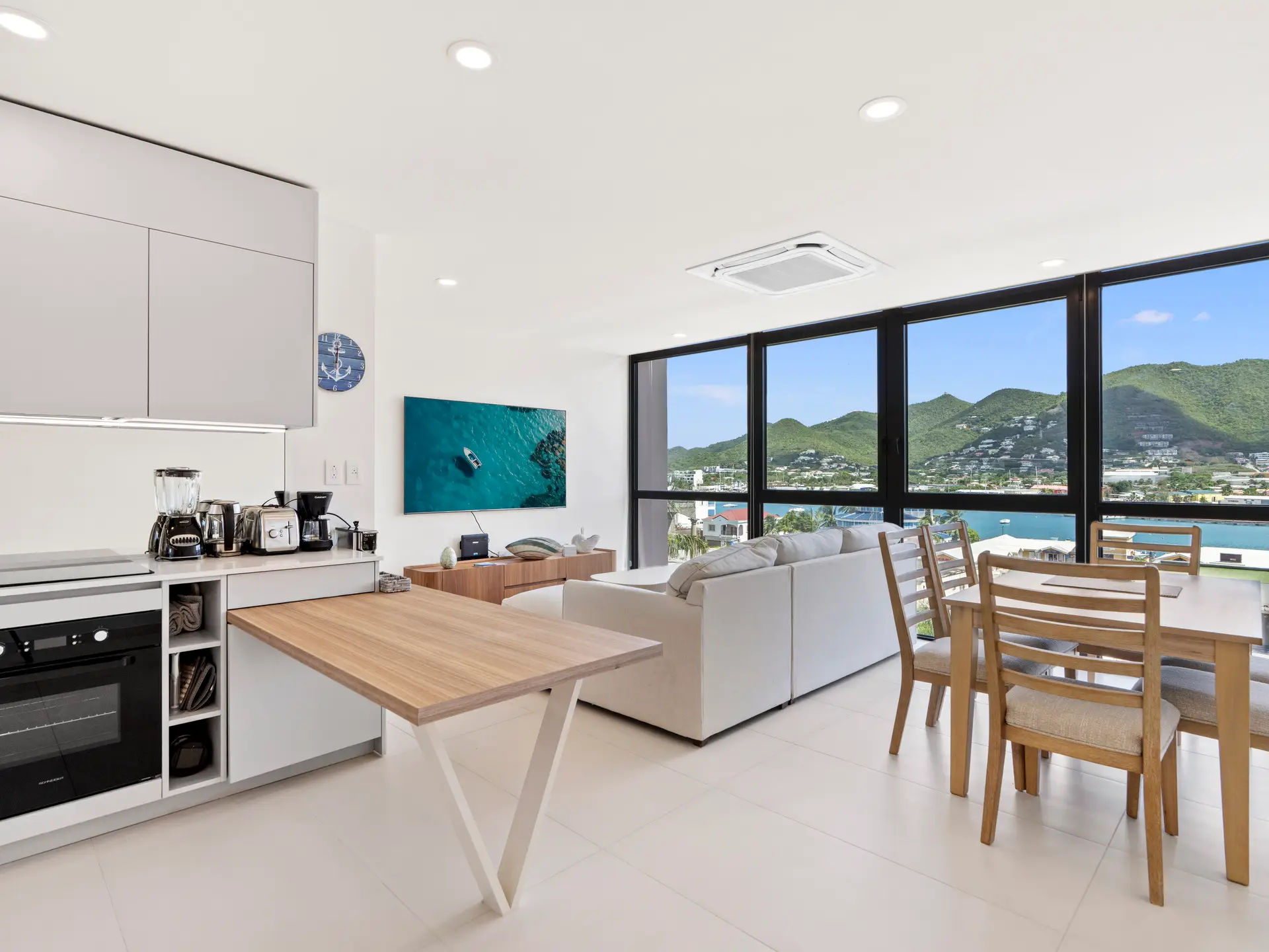 The living room is spacious and ideal for relaxing or spending time with loved ones. The large glass wall lets in plenty of natural light and gives you beautiful views of the Simpson Bay Lagoon. It’s the perfect spot to enjoy your morning coffee or unwind after a day out.
