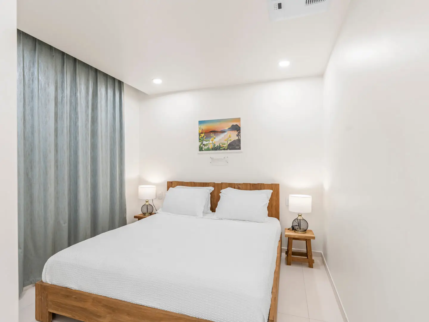 The bedroom in B207 is a sanctuary of tranquility, furnished with a luxurious bed that promises restful nights. High-quality linens and ample storage space add to the comfort and convenience of the stay.