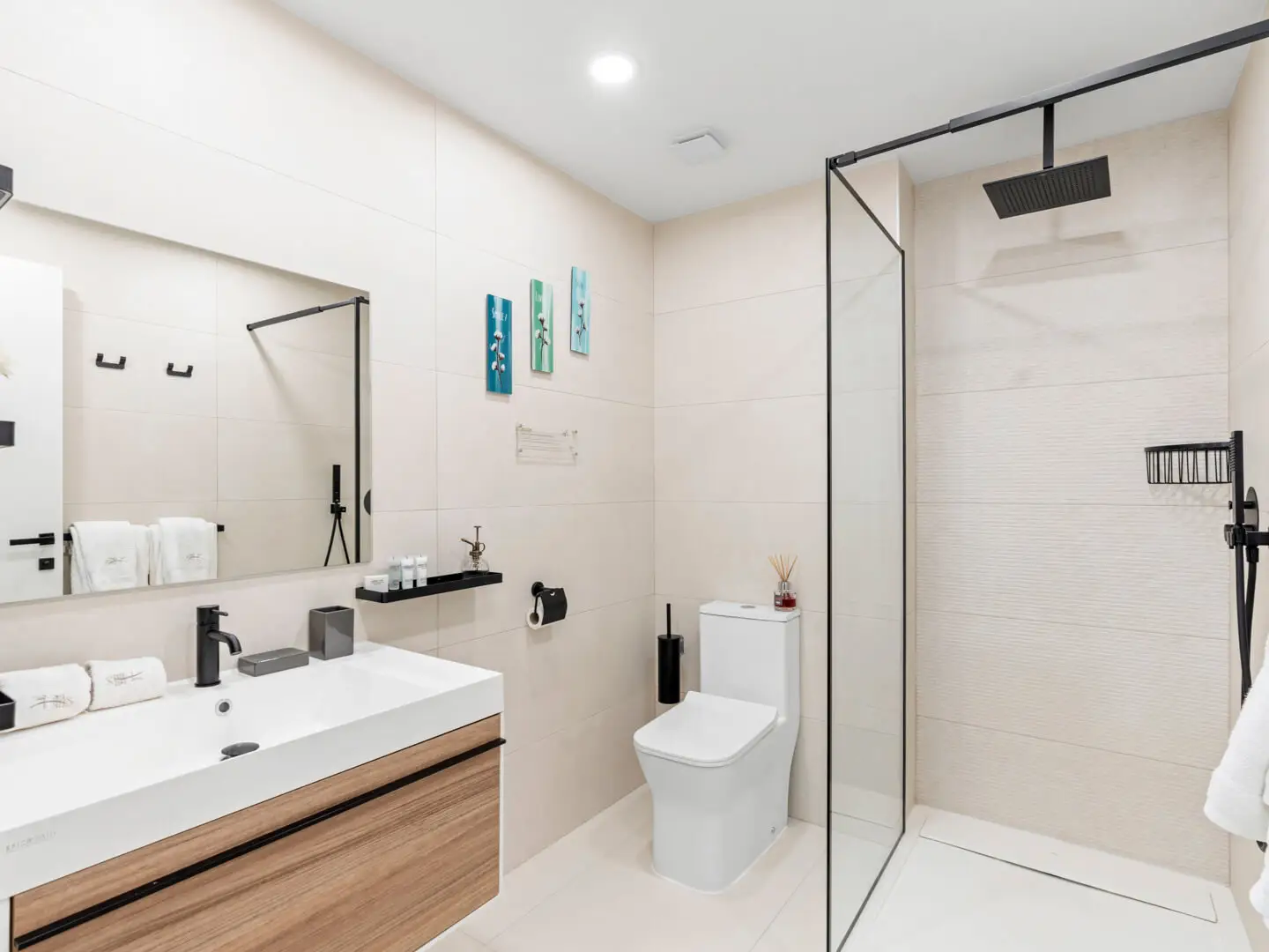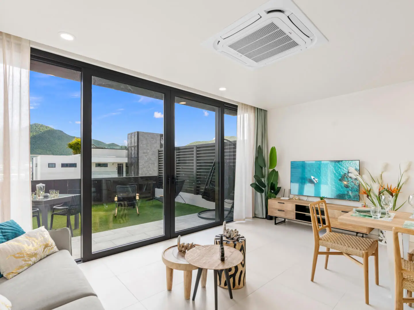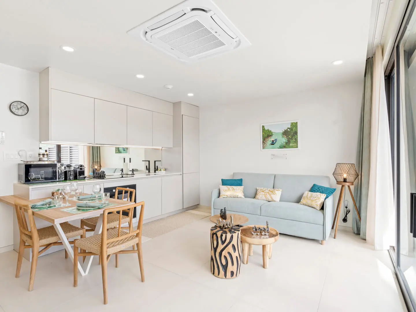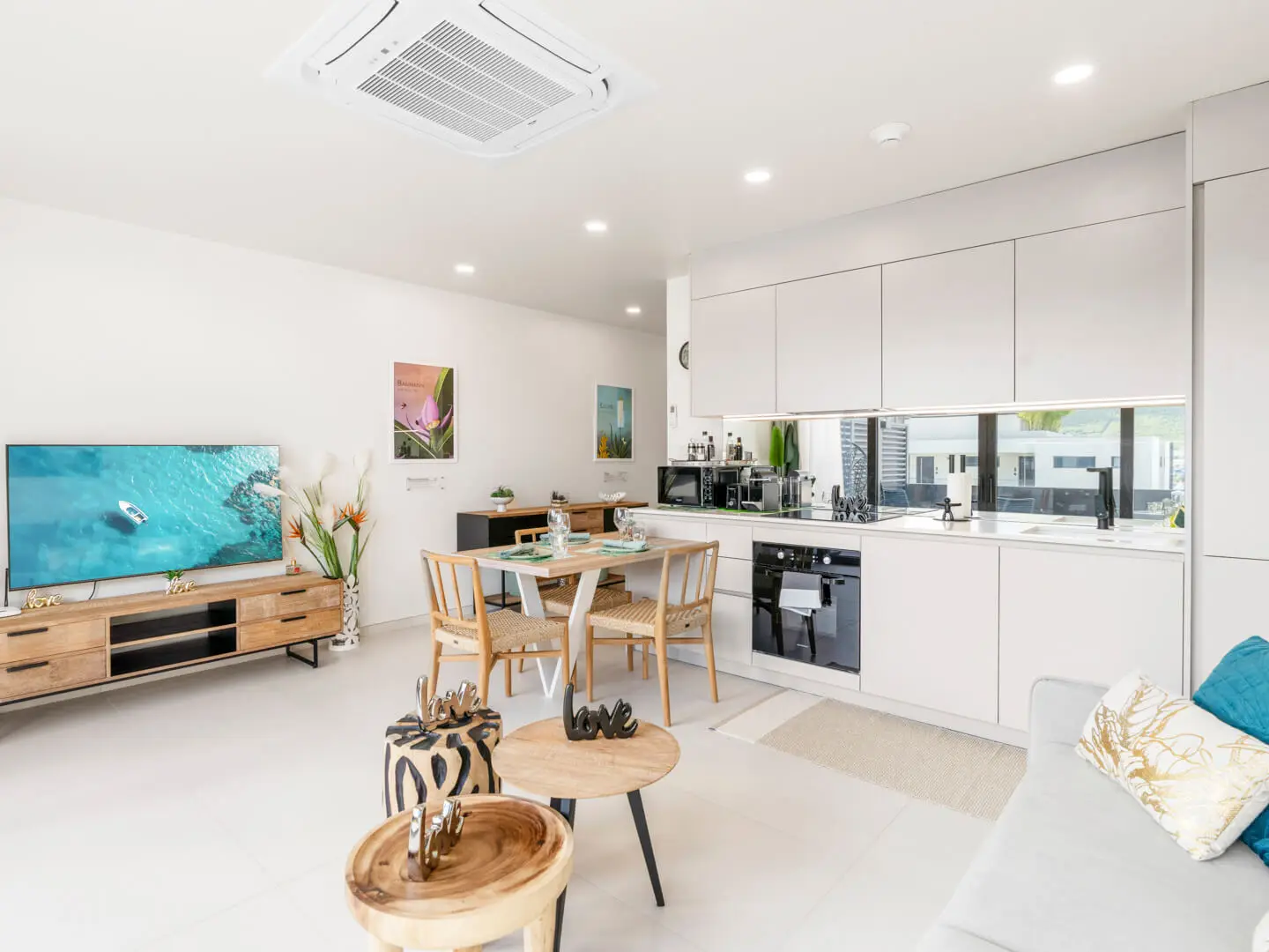 Upon entering B207, you are greeted by a thoughtfully designed interior that combines modern aesthetics with cozy charm. The open-plan living area is adorned with chic furnishings and is bathed in natural light, fostering an inviting atmosphere ideal for unwinding after a day of island exploration.