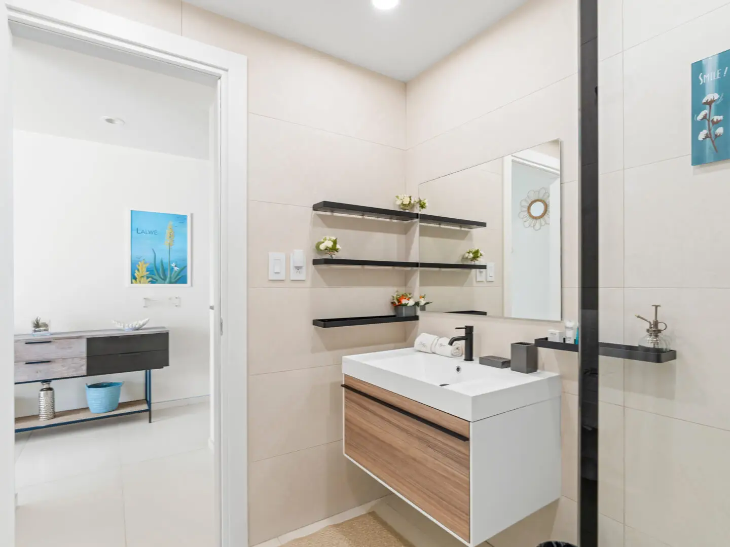 The fully equipped kitchen is both functional and stylish, featuring modern appliances that cater to all culinary needs, whether you’re a gourmet chef or prefer simple meals. The seamless flow from the kitchen to the living area ensures that you remain connected with guests or family while preparing meals.