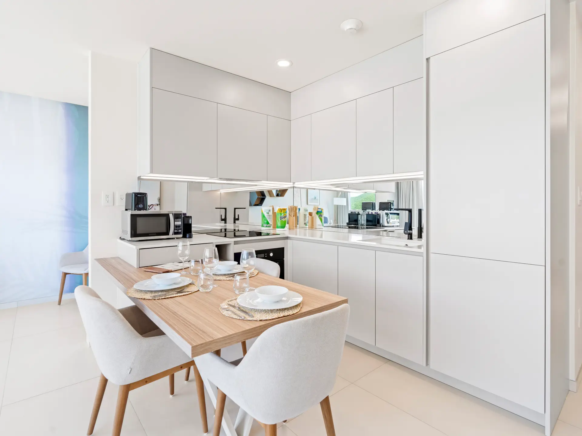 The modern, fully-equipped kitchen invites you to prepare delicious meals that you can savor while facing the splendid Simpson Bay lagoon—the ideal place to relax and rejuvenate.