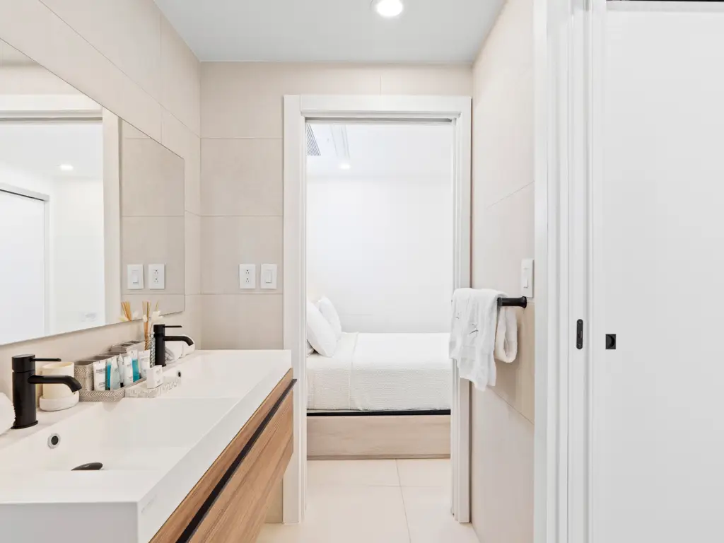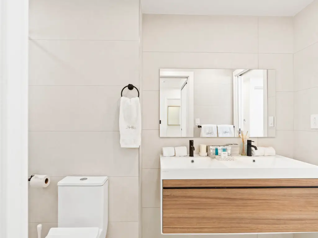 Both bedrooms are thoughtfully designed to offer maximum comfort and privacy. The primary bedroom features large windows that fill the space with natural light and an en-suite bathroom with a single vanity and luxurious rain shower, creating a spa-like retreat. The second bedroom is equally inviting—ideal for family, friends, or guests—and is conveniently located near the second full bathroom, which is elegantly appointed with modern fixtures.