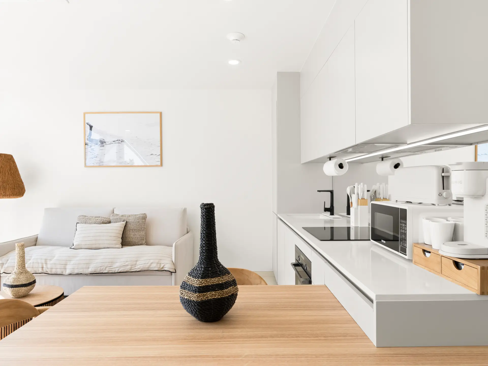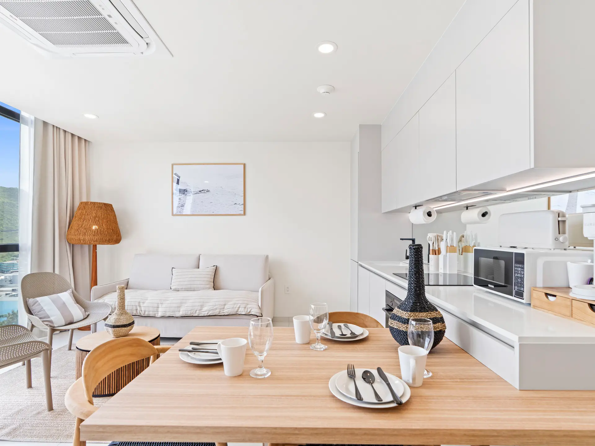 Inside, you’ll find a cozy bedroom, a sleek bathroom, and an open-concept living area that flows into a fully equipped kitchen—perfect for everything from morning coffee to romantic dinners with a view.