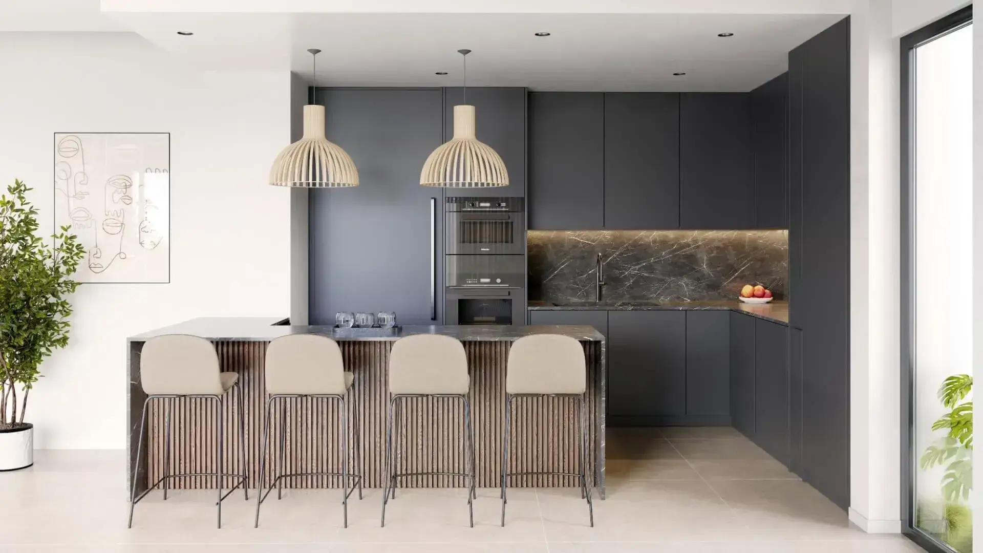 Expansive, fully equipped kitchen with state-of-the-art appliances and sleek modern finishes. The bright living area provides a welcoming space to relax, entertain, or enjoy lagoon views.