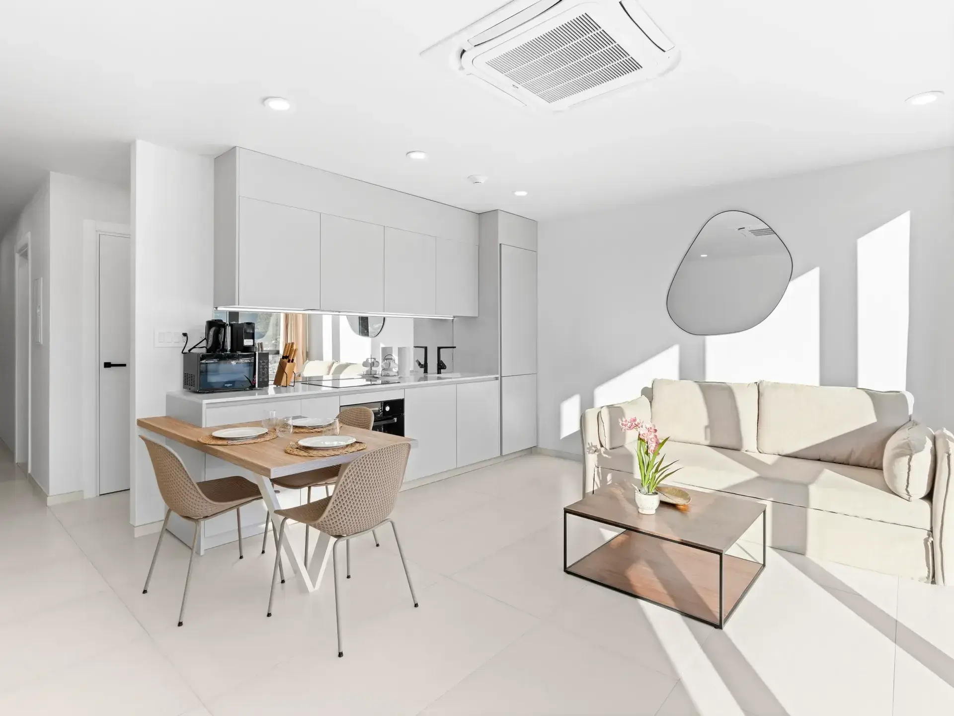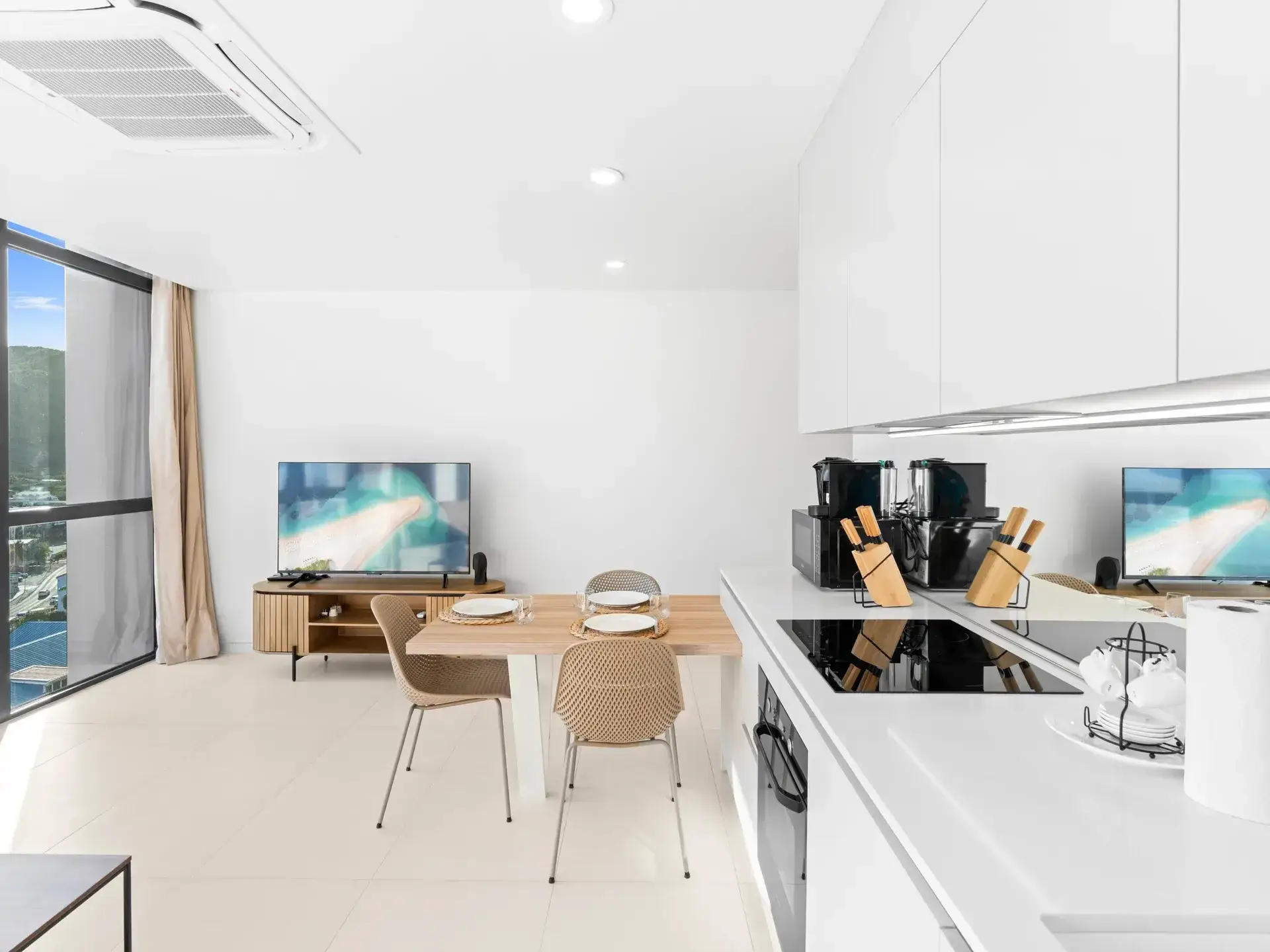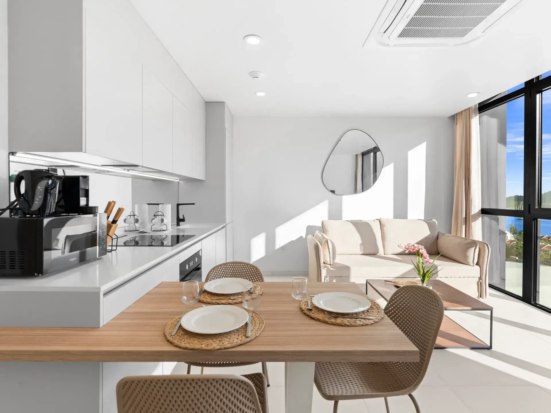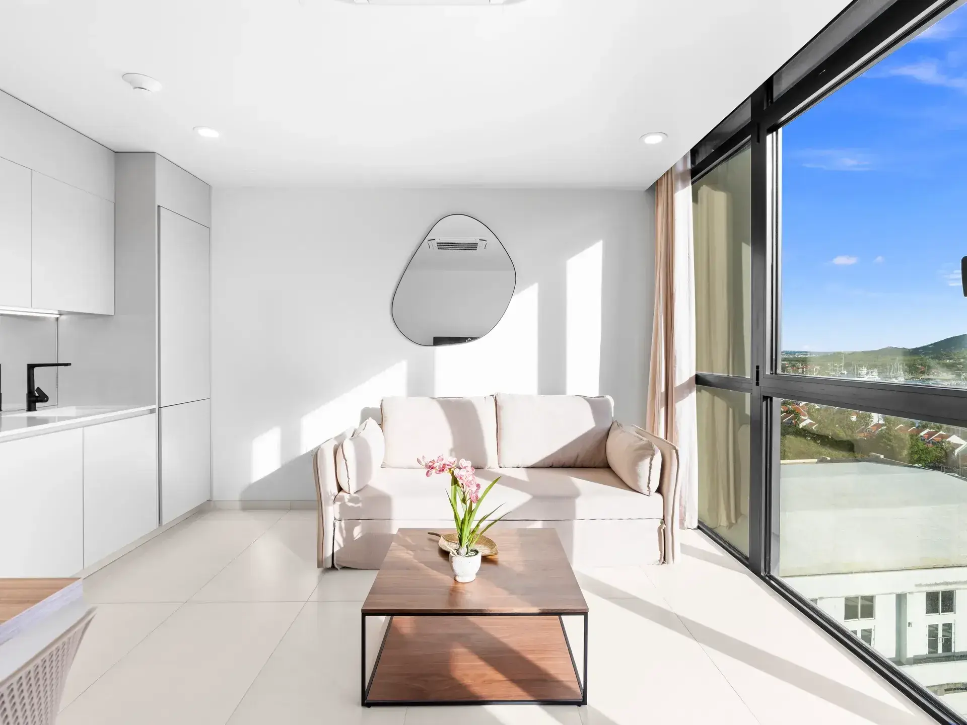 Private balcony offering serene lagoon views and natural light throughout the apartment