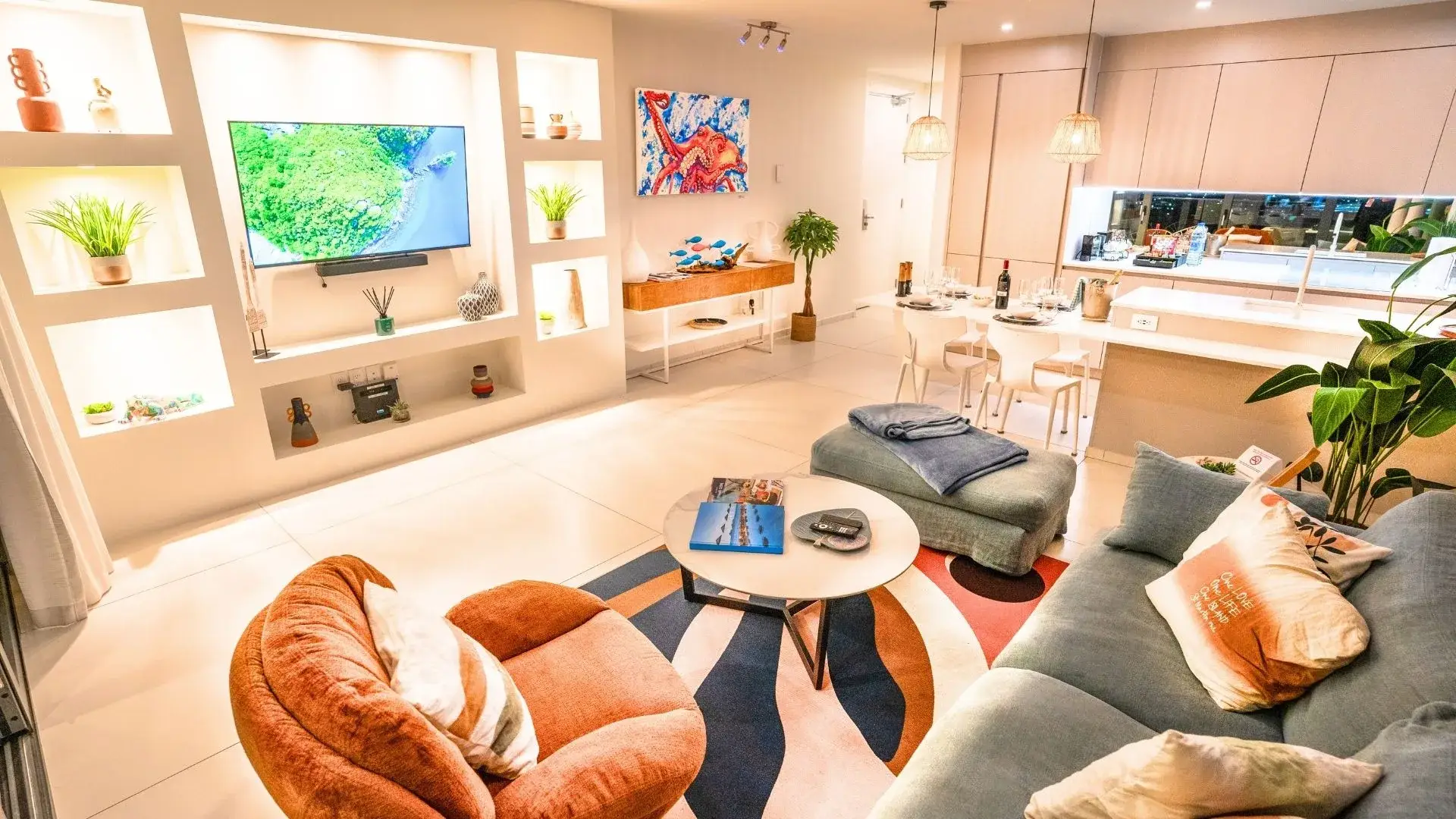 The living-dining area is designed for relaxation and entertainment. Highlights include: