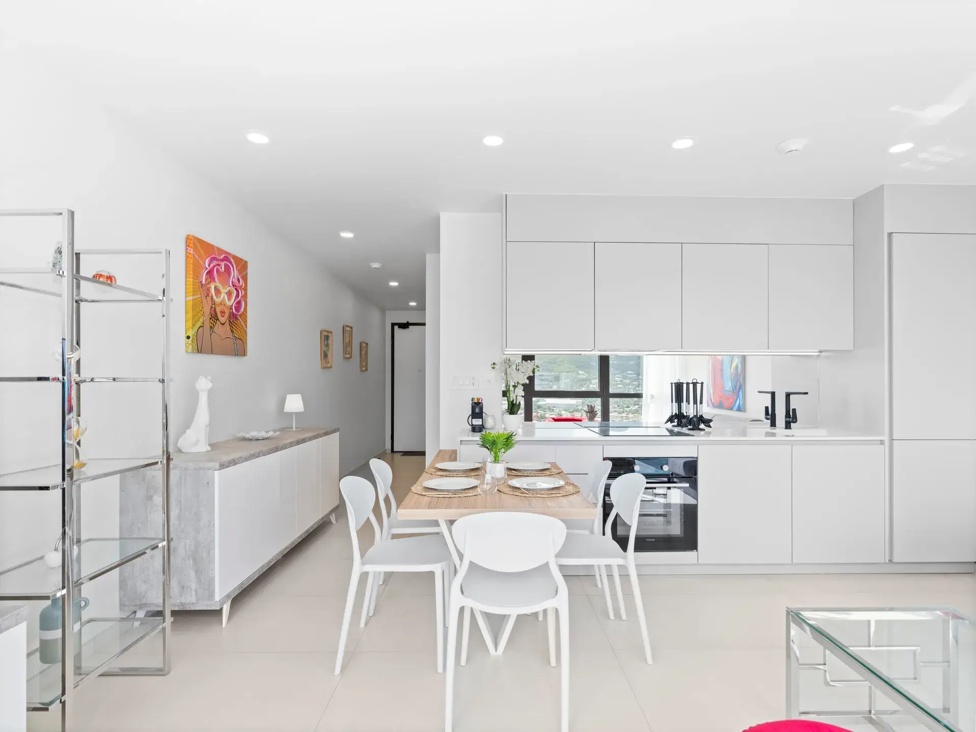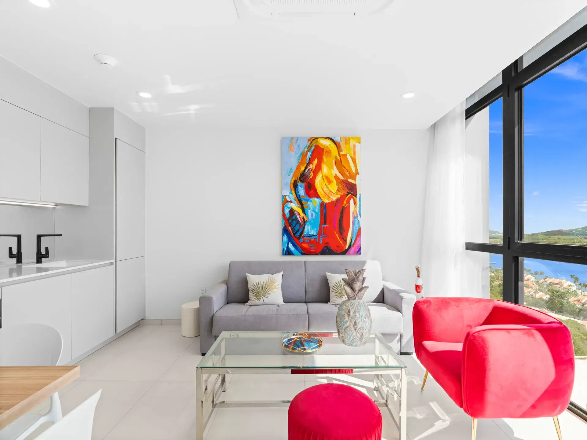 Experience the ultimate in convenience and luxury with this fully furnished, turnkey 1-bedroom condo located on the top floor of The Hills Residence in Simpson Bay, Sint Maarten. Spanning 57m², this property is perfectly situated in the heart of activities, offering easy access to beaches, dining, and entertainment. With a common rooftop featuring a pool and two jacuzzis, as well as private parking, this condo is an exceptional investment opportunity.